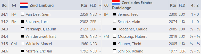 Op de donderdag (vierde ronde) was Eric Jan eindelijk klaar met de werkzaamheden voor de baas en wilde Bob met het oog op het prachtige weer graag een dagje vrij hebben om te wandelen (dus dat kwam goed uit). Voor de eerste keer dit toernooi had het team van de tegenstander (Cercle des Echécs Dudelange uit Luxemburg) gemiddeld een lagere rating. Het werd dan ook een keurige 4-2-overwinning met 2 zeges op de hoogste borden door Siem en Luca (met daarnaast 4 remises).