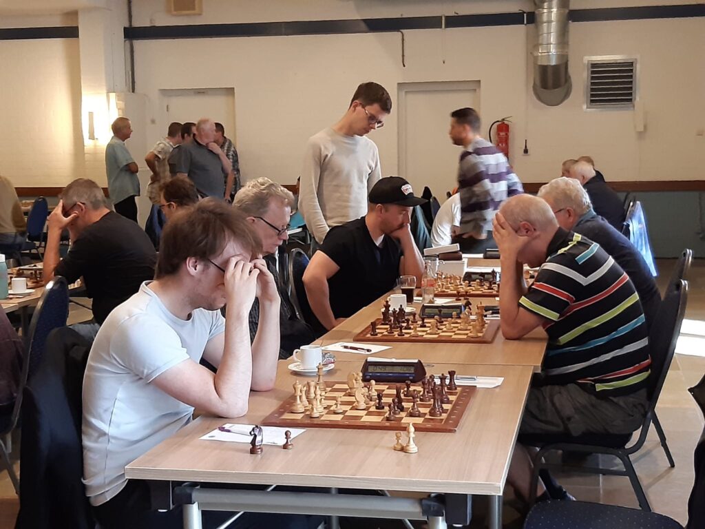 Daarmee kwam de spanning kort terug in de wedstrijd en bleven de partijen van Leon, Barry en Ties over. Leon stond duidelijk beter, Barry had een pion meer, maar begon licht in tijdnood te komen zonder dat hij, voor mij, duidelijke vorderingen kon boeken. En Ties had een ingewikkelde stelling, waarin het nodige duw- en trekwerk gaande was.
