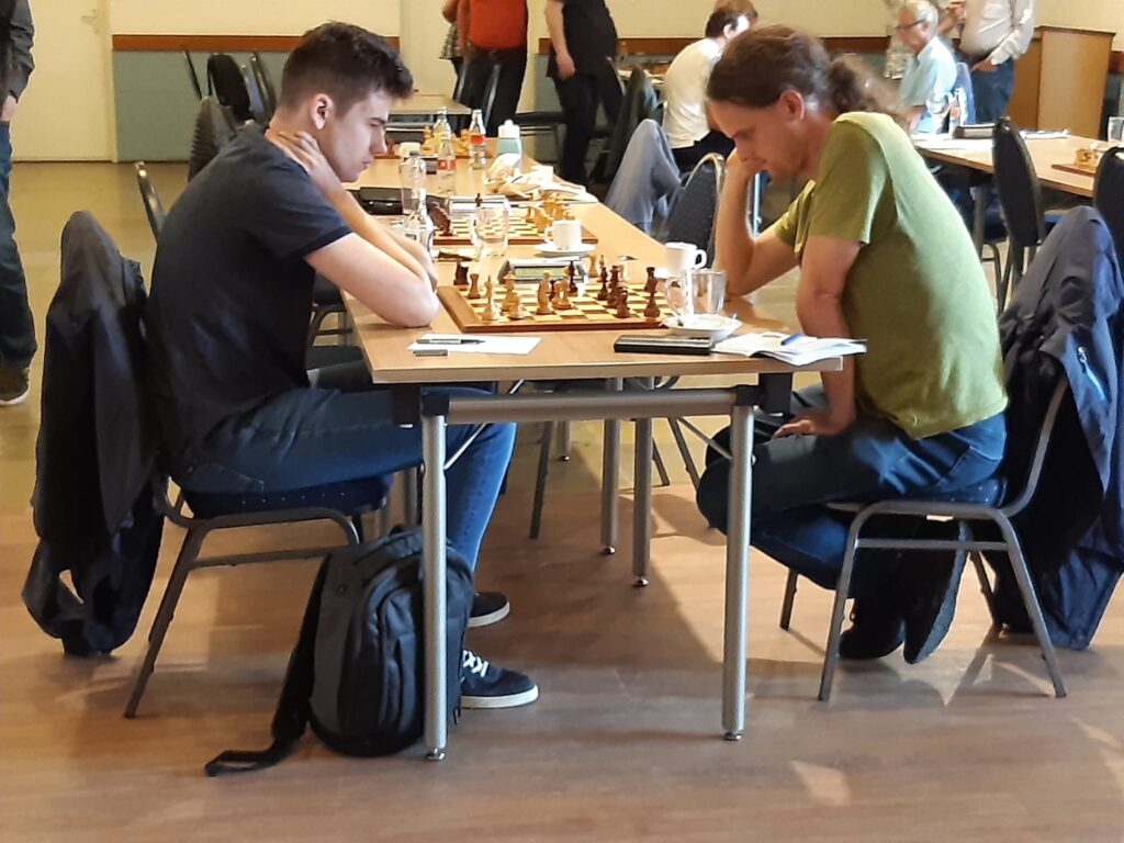 Helaas kregen we daarna een teleurstelling te verwerken. Guus was goed uit de opening gekomen, maar had tijdens de partij al spijt dat hij niet 16. e4 beantwoord had met 16… Pxe4 met pionwinst. Deze hapering leidde ertoe dat zijn tegenstander de stelling kon consolideren. Guus zijn stukken (vooral de dame) bleken vervolgens niet optimaal te staan. Onze speler had het gevoel achter de feiten aan te lopen en kon helaas het witte offensief niet meer verhinderen (2-3).