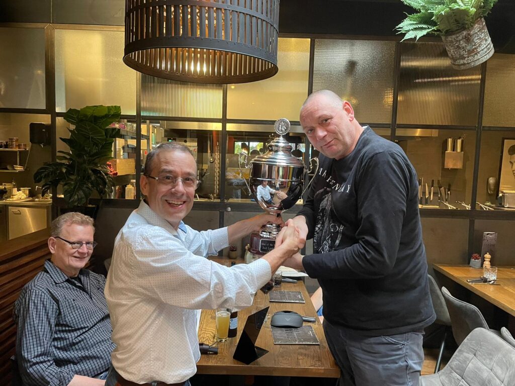 Daarna werd in Veldhoven een leuke eetgelegenheid opgezocht, waar Leon uitgeroepen werd tot Man-of-the Match. Zie onderstaande foto waarop Leon door de ad-interim TL gefeliciteerd wordt met de wisselbeker (Ties staat helaas niet op de foto en Guus was de fotograaf).