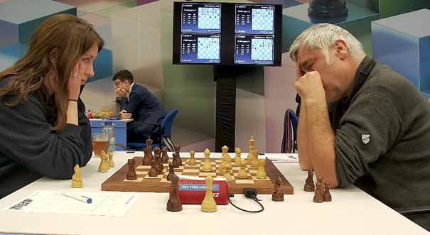 De enige dame in de ontmoeting speelde tegen de speler met de laagste rating van Charlois Europoort. Ze kwam sterk uit de opening en won na het (voor mij) onbegrijpelijke 24…h6 een pion.  Maar ze verspeelde haar voordeel weer. Totdat de tegenstander in het eindspel op zet 50 blunderde. En daarna maakte ze het technisch keurig af.