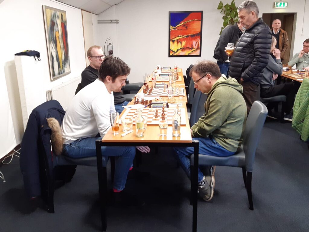 Op het hoogste bord had Tom (bord 1, zwart) de altijd gevaarlijke Rene Snoeck als tegenstander. In het vroege middenspel werd het al snel scherp met tegengestelde rochades. Tom offerde een kwaliteit om dichtbij de witte koning te komen, maar een paar zetten later offerde hij zijn paard op het verkeerde veld (c3 in plaats van b2). Uiteindelijk had de witspeler het verste gekeken en maakte hij het op een mooie manier af. Een analyse is hieronder te vinden.