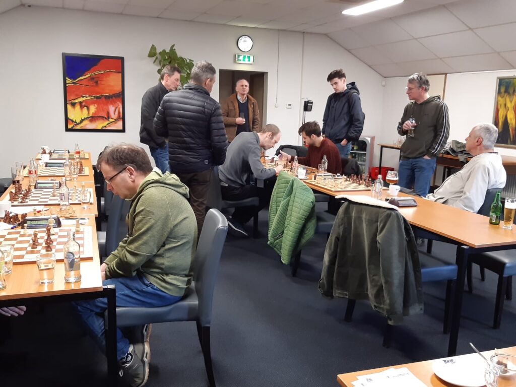 Sander en Guus waren verhinderd, terwijl op de wedstrijddag Rien zich afmeldde met griepklachten. Gelukkig was al snel een vervanger gevonden in de persoon van Ger, door het voorspelde hondenweer ging zijn wandelafspraak niet door. Even voor 13 uur kreeg Bob een telefoontje van Jan dat hij in de file op de A76 stond en dus later zou arriveren. Een dikke 10 minuten na de start van de wedstrijd, die onder leiding stond van Rick met assistentie van Claudia, verscheen Jan (bord 2, wit) achter het bord om niet veel later de felicitaties al in ontvangst te mogen nemen. ZIjn tegenstander gaf op zet 11 een pion weg en had geen zin om de rest van de middag te verdedigen en gaf een zet later op.