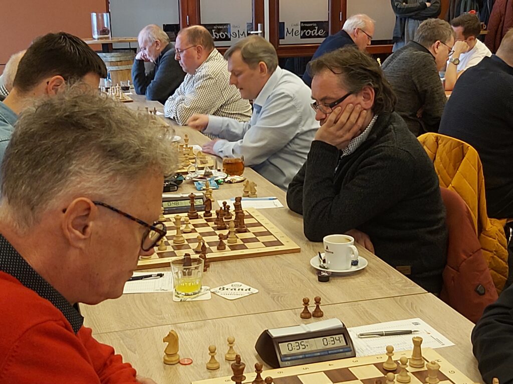 Max had helaas zijn plan niet kunnen uitvoeren wat zijn tegenstander Twan Rutjes wel lukte. 1-1. Eric-Jan en Henk van Kortenhof besloten tot remise wat ook het resultaat was bij de partij Ronny Willen – Henk Massink. Voor ons geen slecht resultaat, beide tegenstanders waren op rating sterker. 2-2. Daarna kon Het Kasteel een fraai punt bijschrijven. Kaz Haans won van Marcel Frenken die toch op rating geacht werd te winnen. Maar rating zegt duidelijk niet alles, een misrekening of een blunder is makkelijk gemaakt. Wat er precies is misgegaan weet ik niet. Voor Marcel komt hiermee een einde aan een fraai reeks van drie overwinningen op rij. Kaz kon wel zijn uitstekende reeks voortzetten en staat dit seizoen op 6 uit 7, gefeliciteerd! 2-3.