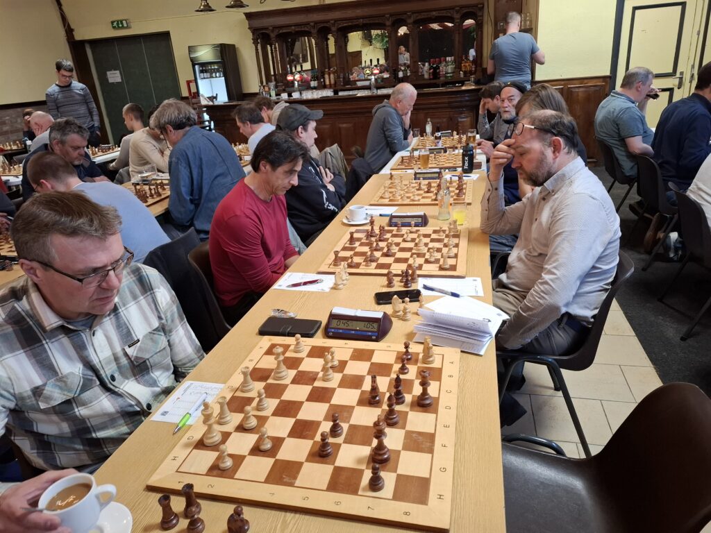 De kampioenswedstrijd zelf verliep onverwachts gemakkelijk. Afgezien van Fabian aan bord 1 waren er geen grote ratingverschillen. Toch was al halverwege de middag duidelijk dat we de minimale 4-4 uitslag om kampioen te worden zeker zouden gaan halen. Toen ik na een uurtje de stand op de borden naast me eens bekeek, zag ik zowel links als rechts van me materieel voordeel plus aanval. John H had met zijn wiite paard een zwarte toren uit de hoek weggesnoept, terwijl Jeroen met zijn dame het ene na het andere pionnetje op de vijandelijke koningsvleugel pakte.